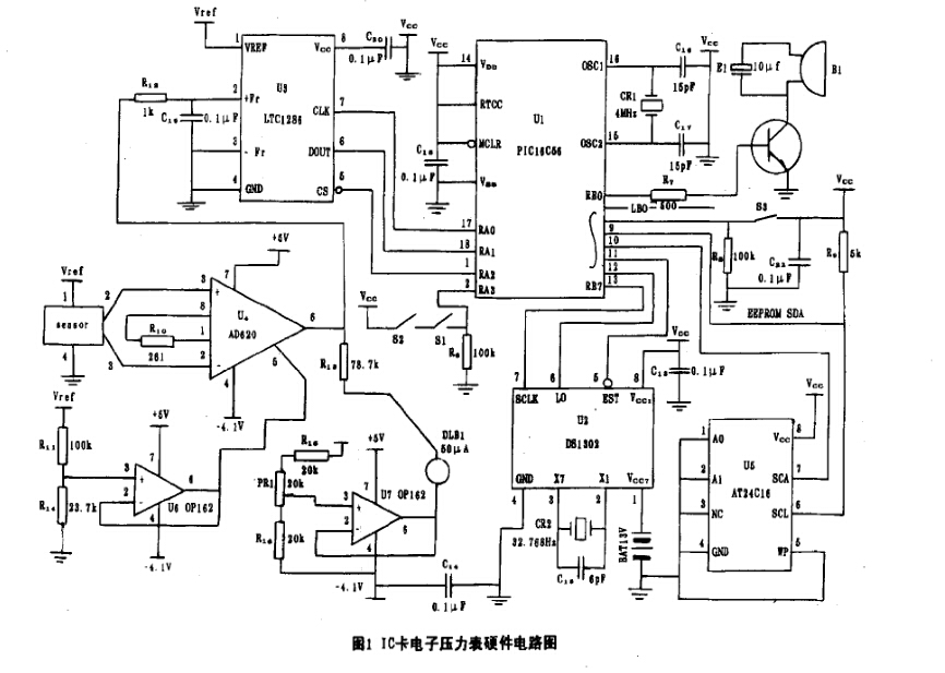 圖1為1C卡電子壓力表硬件電路原理圖。